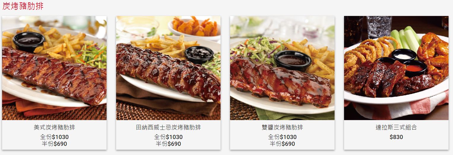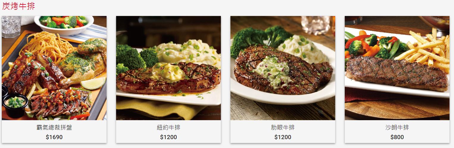 這裡有各式巨大的餐點,如碳烤豬肋排、炭烤紐約客牛排、炭烤肋眼牛排、炭烤沙朗牛排等。 也少不了手工漢堡跟薯條,培根起斯漢堡、超級三重奏漢堡、威士忌漢堡等,會附上大薯條。 誘人的各式甜點,摩卡咖啡冰淇淋派、巧克力布朗尼、紐約起司蛋糕。 以及各式啤酒、調酒、和飲料,如精釀生啤酒、特選瓶裝啤酒、葡萄酒、瑪格麗特、和特製調酒等。 更多餐點請參考官網的菜單。 已非吃到飽來說,餐點價格都不低,人均餐費約 600 - 2400。 當然,其食材用料都很實在,調味也都棒極了。