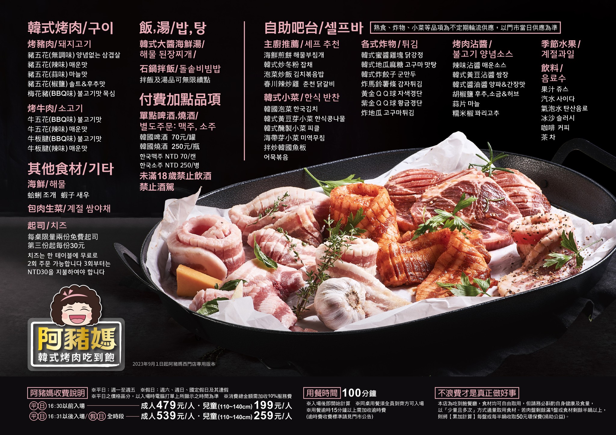 阿豬媽是韓式烤肉,也有提供火鍋的火烤兩吃吃到飽餐廳。 用餐時間為 100 分鐘。 價位上算是平價的吃到飽,當然價格也會反應到食材的等級與新鮮度。 用餐環境裝潢、維護的還算滿有質感。 從人氣上來看,還是有不少人接受這類型的餐飲方式。
